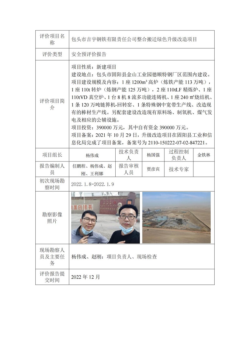 包头市吉宇钢铁有限责任公司整合搬迁绿色升级改造项目安全预评价报告公示信息表