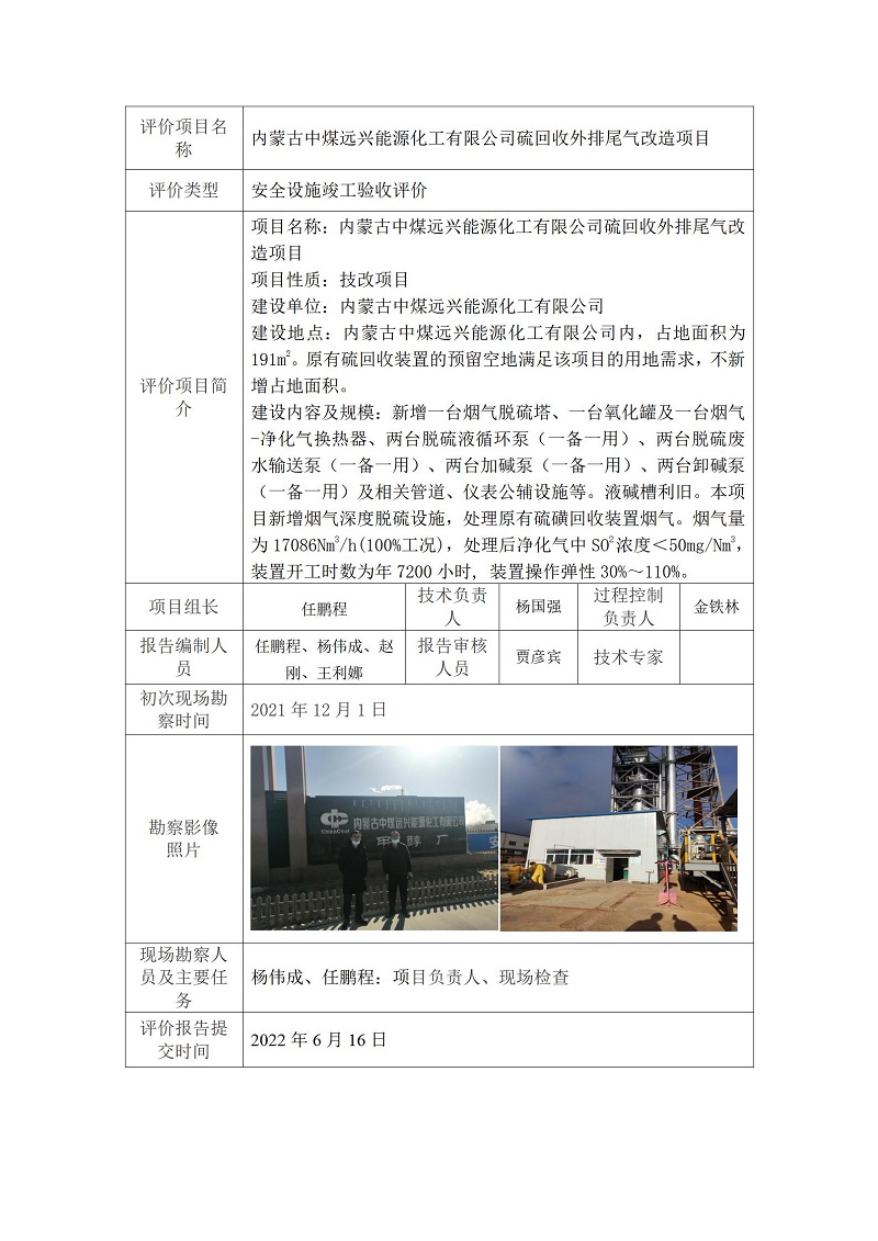内蒙古中煤远兴能源化工有限公司硫回收外排尾气改造项目