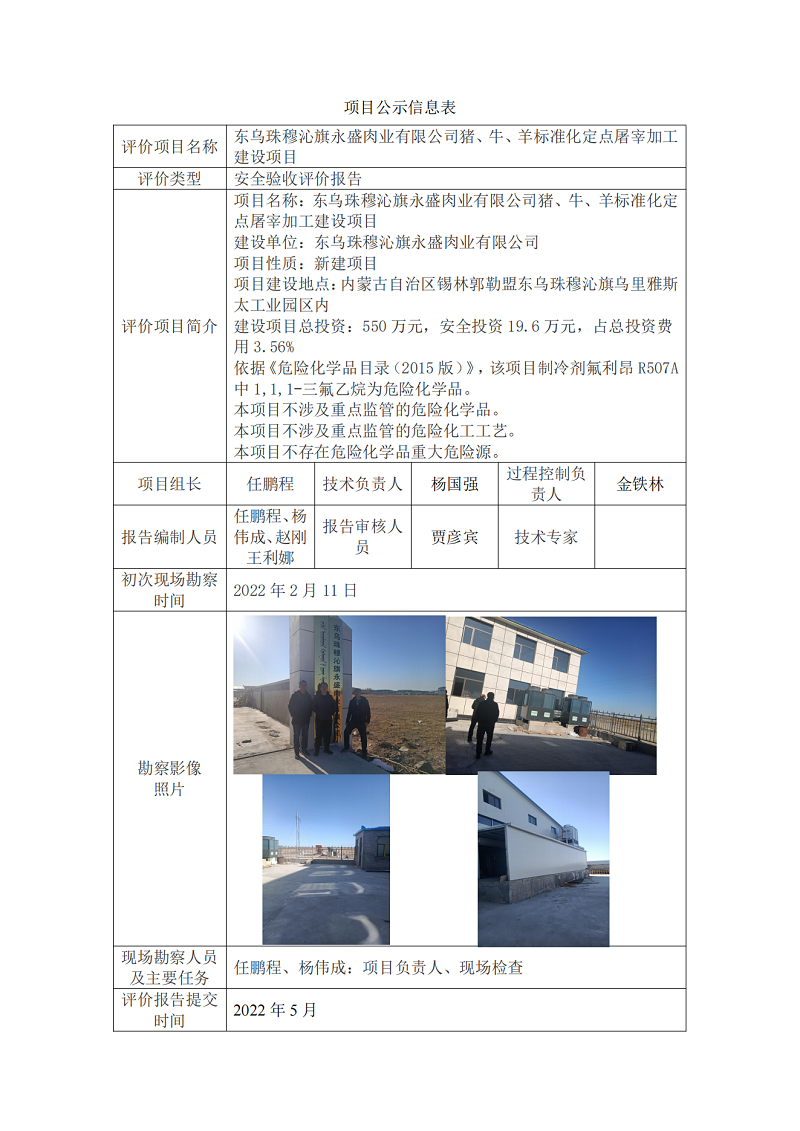 东乌珠穆沁旗永盛肉业有限公司猪、牛、羊标准化定点屠宰加工建设项目安全验收评价公示信息