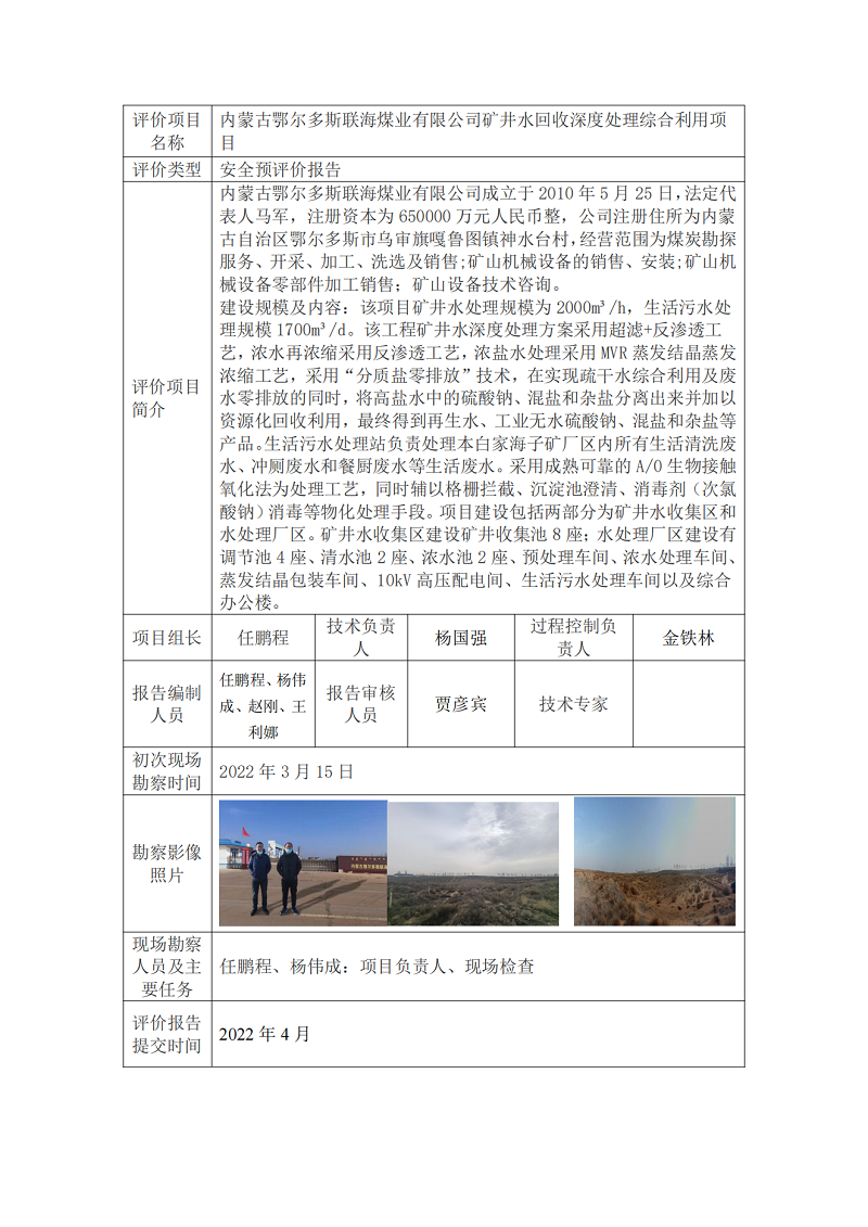 内蒙古鄂尔多斯联海煤业有限公司矿井水回收深度处理综合利用项目安全预评价公示信息表