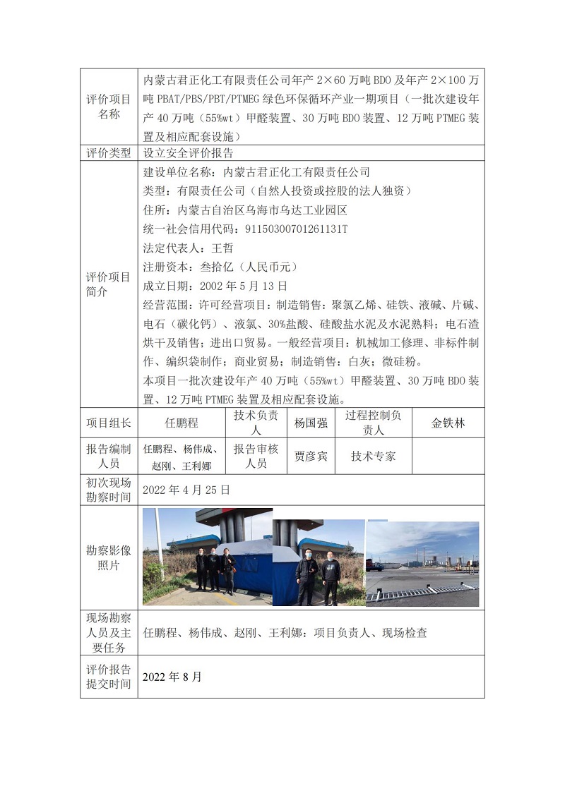 内蒙古君正化工有限责任公司绿色环保循环产业一期项目公示信息表