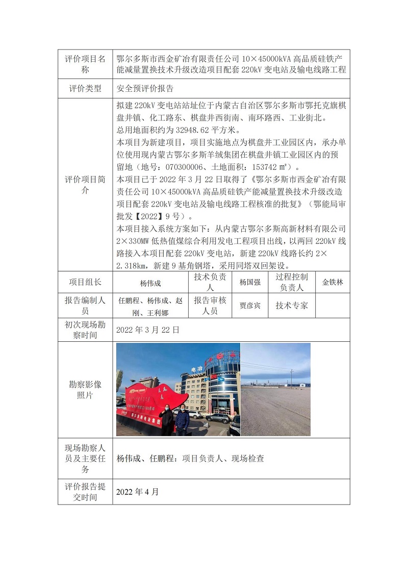 鄂尔多斯市西金矿冶有限责任公司配套220kV变电站及输电线路工程安全预评价公示信息表