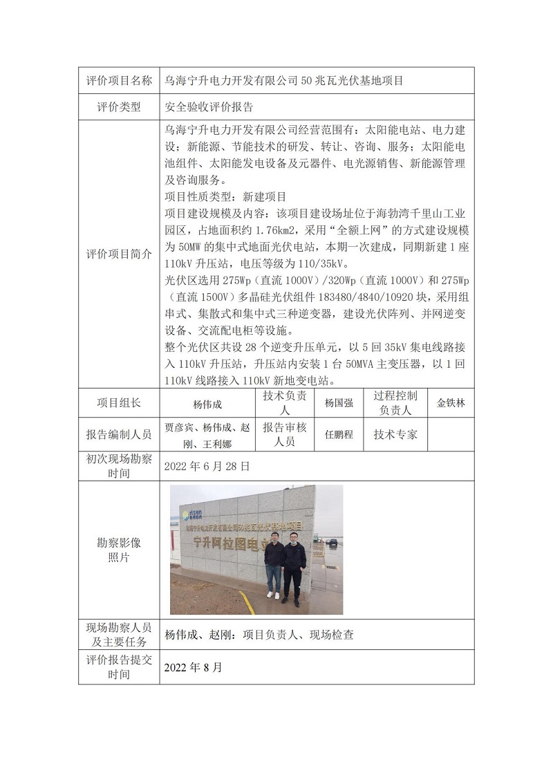 乌海宁升电力开发有限公司50兆瓦光伏基地项目安全验收评价报告公示信息表