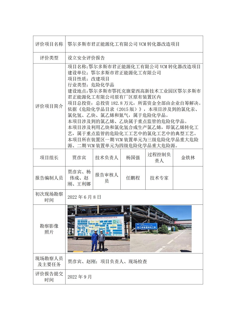 鄂尔多斯市君正能源化工有限公司VCM转化器改造项目公示信息表