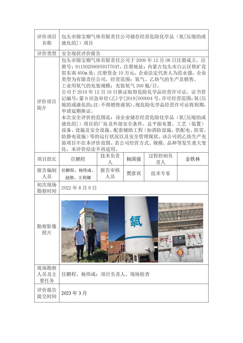 包头市锦宝顺气体有限责任公司储存经营危险化学品(氧[压缩的或液化的])项目安全现状评价报告