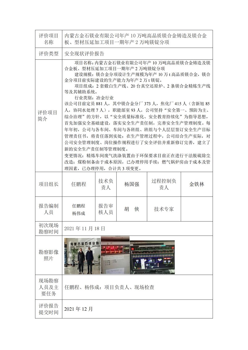 内蒙古金石镁业有限公司年产10万吨高品质镁合金铸造及镁合金板、型材压延加工项目一期年产2万吨镁锭分项安全现状评价报告