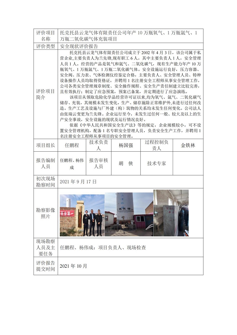 托克托县云龙气体有限责任公司年产10万瓶氧气、1万瓶氩气、1万瓶二氧化碳气体充装项目安全现状评价报告