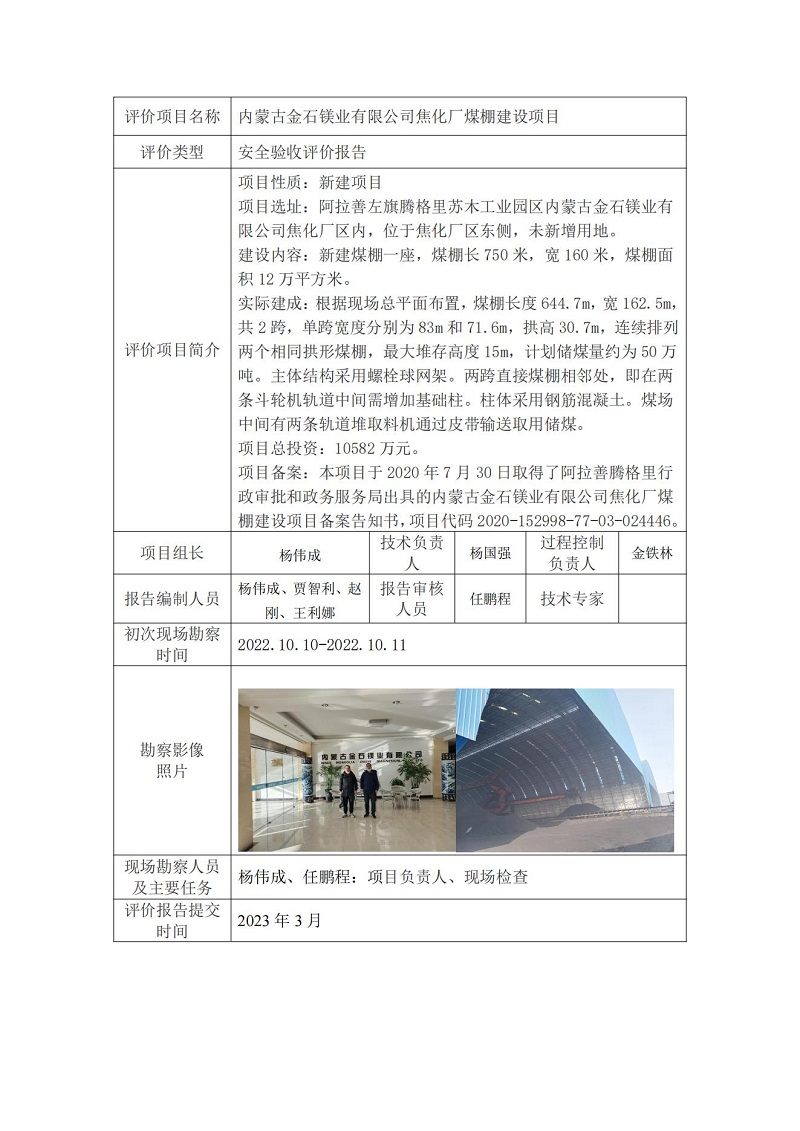 内蒙古金石镁业有限公司焦化厂煤棚建设项目安全验收评价报告公示信息表