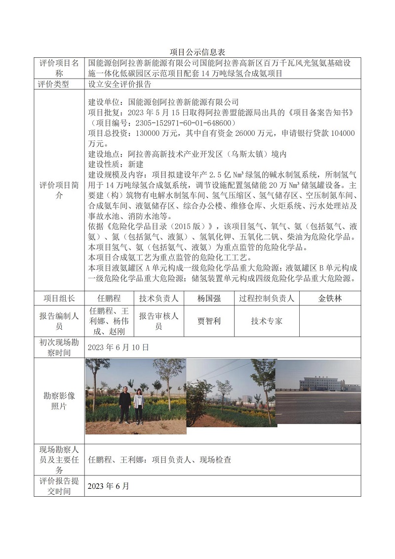 国能源创阿拉善新能源有限公司国能阿拉善高新区百万千瓦风光氢氨基础设施一体化低碳园区示范项目配套14万设立安全评价报告吨绿氢合成氨项目