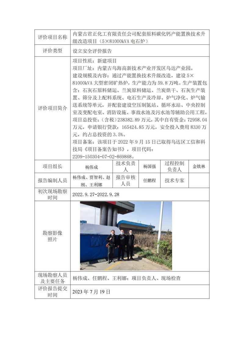 内蒙古君正化工有限责任公司配套原料碳化钙产能置换技术升级改造项目(5×81000kVA)设立安全评价报告公示信息表