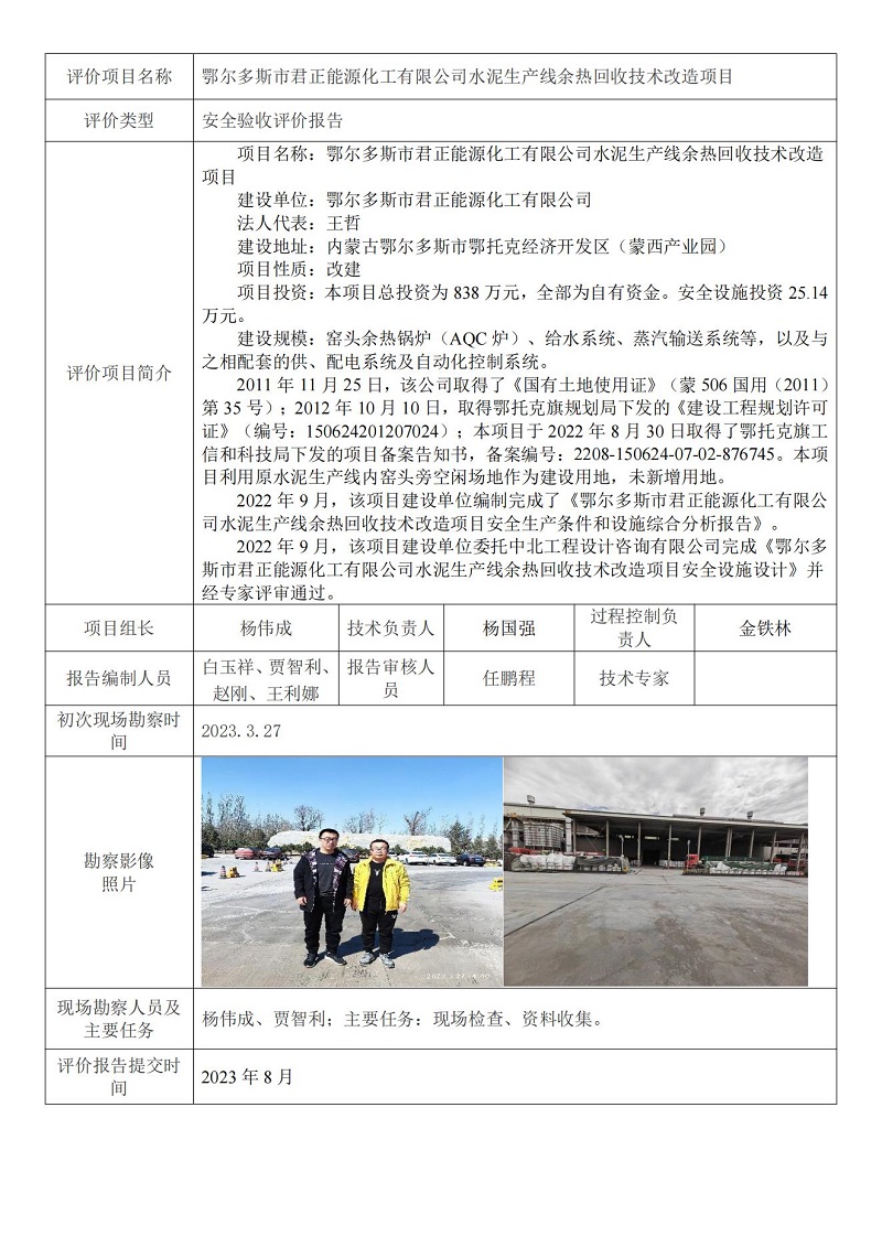 鄂尔多斯市君正能源化工有限公司水泥生产线余热回收技术改造项目
