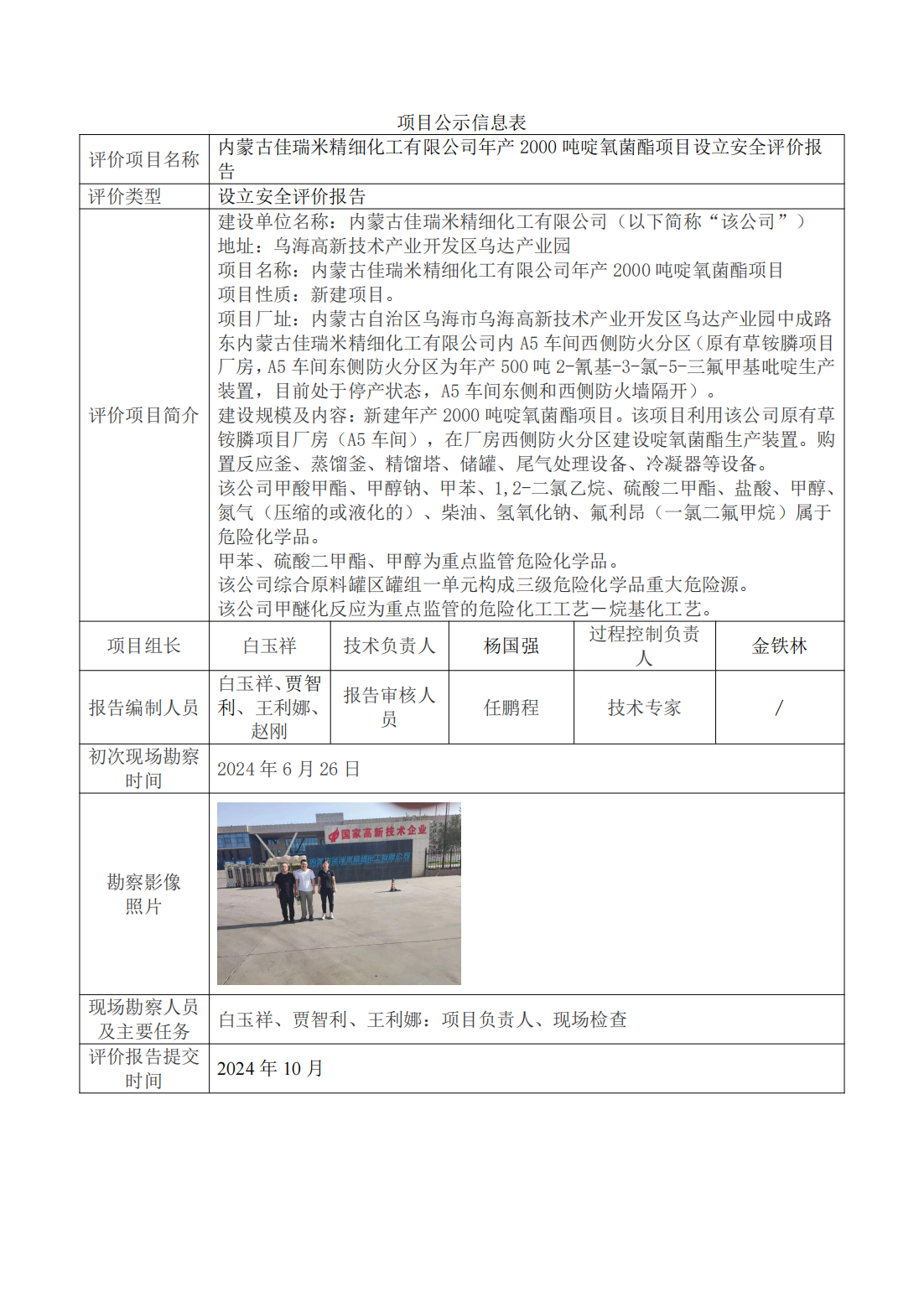 内蒙古佳瑞米精细化工有限公司年产2000吨啶氧菌酯项目设立安全评价报告